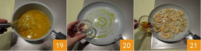 et continuez avec le fouet jusqu'à ce qu'elle arrive à ébullition 19. Mettez sur le feu une grande casserole antiadhésive avec un filet d'huile et la gousse d'ail 20, faites-la blondir puis retirez-la. Faites cuire les crevettes pendant 4 minutes à feu moyen, en flambant avec le brandy restant 21.