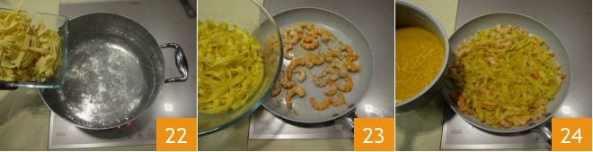Dans une casserole, portez à ébullition l'eau salée, puis faites cuire les fettuccine pendant 3 minutes 22. Une fois prêtes, égouttez-les, puis versez-les directement dans la poêle avec les crevettes 23. Ajoutez également la crème de crevettes et brandy que vous avez préparée 24