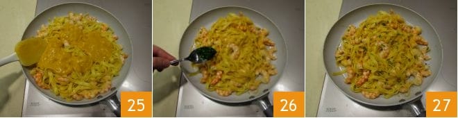 et mélangez avec la spatule pour bien amalgamer tous les ingrédients 25. Faites sauter les fettuccine dans la sauce pour donner du goût et terminez par une pincée de persil haché 26; enfin, vous pouvez servir vos fettuccine à la crème de crevettes et brandy 27.