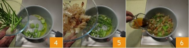 les tiges de persil 4. Ajoutez les coquilles des crevettes que vous avez mises de côté 5 et versez la moitié de la dose de brandy 6, en laissant cuire pendant 10 minutes.
