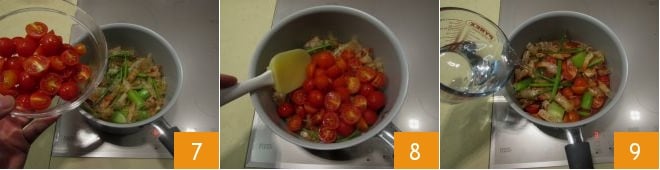 Ajoutez également les tomates cerises 7 et mélangez avec une spatule de cuisine ou une cuillère en bois, en laissant cuire encore 10 minutes 8. Versez l'eau 9