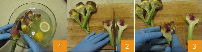 Commencez la préparation des fettuccine aux artichauts et queues de crevettes par le Comment nettoyer les artichauts : retirez les feuilles les plus externes et coriaces, en gardant les cœurs d'artichauts dans de l'eau acidulée avec du jus de citron 1, coupez les pointes qui ont des épines, puis divisez les artichauts en deux 2 et avec une cuillère parisienne, enlevez le foin central 3.