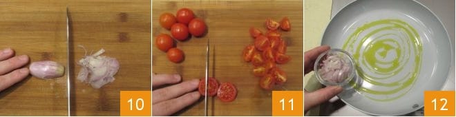 Pelez l'échalote et hachez-la finement 10, lavez les tomates cerises et coupez-les en quartiers 11. Maintenant, dans une poêle, chauffez l'huile d'olive, ajoutez l'échalote hachée 12 et laissez cuire à feu doux pendant au moins 5 minutes. Si cela devient trop sec, ajoutez une cuillère de fumet de poisson ou d'eau.