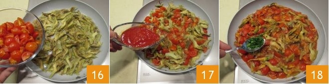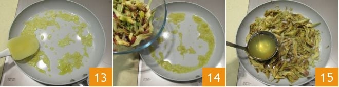 Lorsque l'échalote est fondue 13, incorporez les artichauts égouttés de l'eau acidulée 14, ajoutez une louche de bouillon de légumes 15,