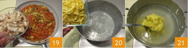 puis ajoutez aussi les queues de crevettes 19, faites-les sauter pendant 5 minutes puis éteignez le feu. Versez également les fettuccine dans l'eau bouillante et faites-les cuire environ 5-6 minutes 20, puis égouttez-les 21,