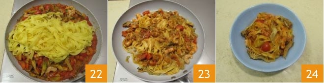 et versez-les directement dans la poêle avec la sauce 22. Faites sauter les fettuccine dans la sauce aux artichauts et queues de crevettes 23 pour les assaisonner puis servez-les bien chaudes 24.