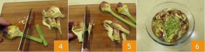 Puis retirez la partie la plus externe de la tige avec un économe et coupez la tige en petits morceaux 4 et le cœur d'artichauts en tranches 5. Conservez les morceaux d'artichauts dans l'eau acidulée 6.