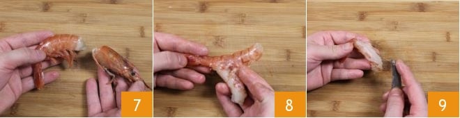 Occupez-vous des crevettes : retirez la tête 7 et la carapace 8, puis retirez délicatement l'intestin en vous aidant d'un cure-dent 9, mettez les crevettes de côté.