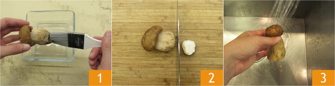 Pour préparer les fettuccine aux champignons et burrata, commencez par nettoyer les champignons : retirez d'abord la plus grande partie de la terre avec l'aide d'un pinceau ou d'une petite brosse 1. Coupez la partie inférieure du pied 2 et rincez-les rapidement sous l'eau courante 3.