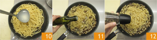 Ajoutez deux louches d'eau de cuisson 10. Mantez avec un filet d'huile 11 et ajustez le sel et le poivre 12 si nécessaire.
