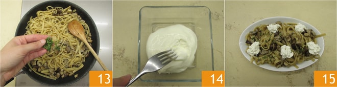 Ajoutez enfin les herbes aromatiques préalablement hachées. Prélevez des morceaux de la burrata 14 et déposez-les sur les fettuccine avant de les servir à table 15.