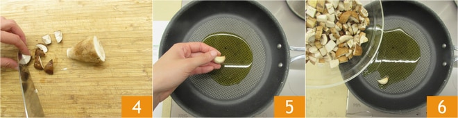 Coupez-les en petits morceaux d'environ 1 cm 4. Placez sur le feu une casserole pleine d'eau salée et portez à ébullition, elle servira pour la cuisson des pâtes. Versez un filet d'huile et une gousse d'ail dans une poêle 5, faites revenir quelques minutes. Lorsqu'elle sera dorée, ajoutez les champignons 6, faites-les cuire à feu moyen pendant quelques minutes.