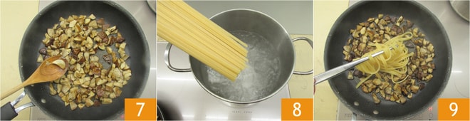 Quand les champignons sont cuits, éteignez le feu, retirez l'ail 7 et réservez-les. Faites cuire les fettuccine dans l'eau bouillante et salée pendant le temps indiqué sur le paquet 8, en prenant soin de les retirer deux minutes avant pour finir la cuisson à la poêle. Égouttez les fettuccine directement dans la poêle avec les champignons 9.