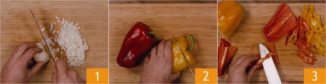 Pour réaliser les fettuccine aux poivrons, commencez par hacher l'oignon 1, puis préparez les poivrons : enlevez le chapeau 2, retirez la tige, les graines et les nervures blanches 3.