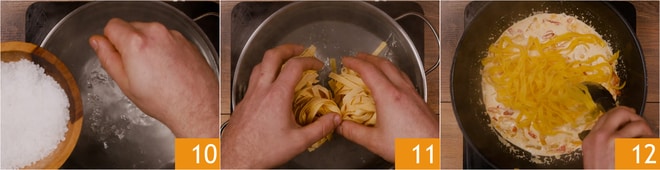 Portez à ébullition une casserole d'eau salée 10 où vous ferez cuire les fettuccine al dente 11. Dès que les fettuccine sont presque cuites, égouttez-les et mélangez-les directement dans la poêle avec la sauce aux légumes 12.