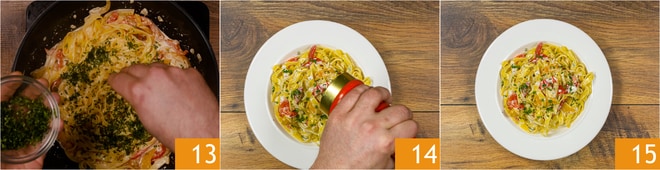 Terminez avec du persil frais 13 et un tour de moulin à poivre 14. Servez immédiatement vos fettuccine aux poivrons 15!