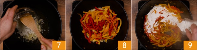Ajoutez l'oignon et laissez-le fondre 7. Lorsqu'il est bien ramolli, ajoutez les poivrons et laissez cuire à feu moyen pendant 10-15 minutes 8. Assaisonnez de sel, ajoutez la crème 9 et terminez la cuisson de la sauce à feu doux.