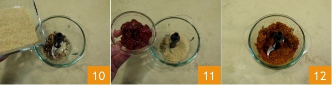 Entre-temps, mettez dans un mixeur équipé de lames les pistaches, la chapelure 10 et les tomates séchées 11 et hachez le tout 12.