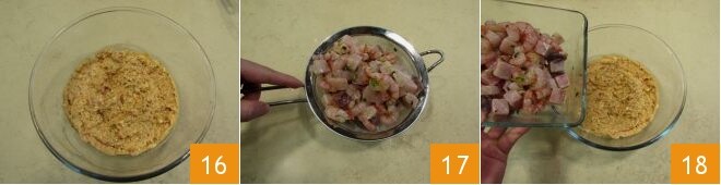 Battez les œufs dans un récipient (réservez-en une petite quantité) et ajoutez-les à la ricotta 13 ; incorporez également le hachis de pistaches et chapelure que vous avez préparé (en réservant 3 cuillères à soupe) 14 et mélangez avec un fouet 15