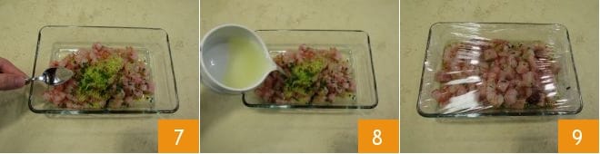 Ajoutez le poivre blanc 7, la pincée de sel et le jus de citron vert 8 et mélangez bien avec une cuillère ; couvrez avec un film plastique et laissez mariner pendant au moins 30 minutes 9.