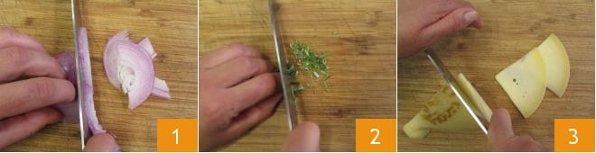 Pour réaliser le feuilleté multigout, épluchez et émincez finement les oignons, puis effeuillez le thym, hachez les aiguilles de romarin 2 et la ciboulette. Coupez également le caciocavallo en tranches fines 3 et réservez.