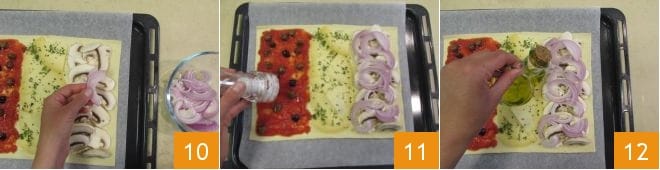 et les oignons 10. Assaisonnez avec du sel 11 et de l'huile d'olive 12, puis faites cuire au four statique à 190° pendant environ 15 minutes au niveau central.