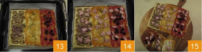 Une fois la cuisson terminée, sortez le feuilleté multigout du four 13, agrémentez-le de morceaux de thon, après l'avoir égoutté 14 et servez-le bien chaud 15 !