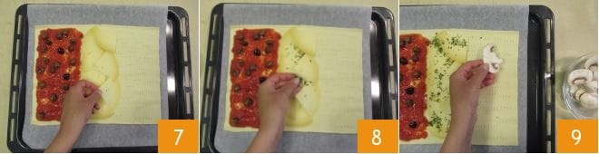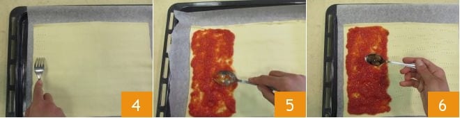 Maintenant, recouvrez une plaque de cuisson de papier sulfurisé, déposez dessus la pâte feuilletée rectangulaire et piquez-la avec les dents d'une fourchette 4. Recouvrez un tiers de la pâte avec la purée de tomates 5 et assaisonnez avec les olives dénoyautées 6.