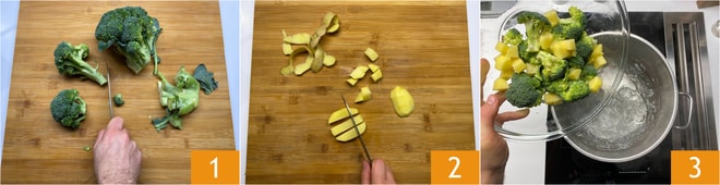 Pour préparer les feuilletés aux brocolis et ricotta, commencez par nettoyer les brocolis. Prélevez des petites fleurettes 1, qui pèseront au total environ 150 g. Passez maintenant aux pommes de terre : épluchez-les et coupez-les en cubes de 1-2 cm 2. Plongez brocolis et pommes de terre 3 dans de l'eau bouillante légèrement salée et faites cuire pendant environ 15 minutes.