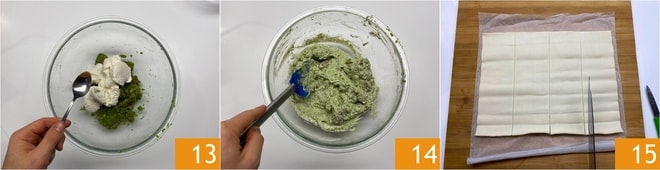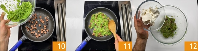 Ajoutez la purée de brocolis et pommes de terre 10 et faites cuire encore quelques instants 11. Éteignez le feu, transférez dans un bol et laissez refroidir. Dès que le mélange est tiède, ajoutez la ricotta 12.
