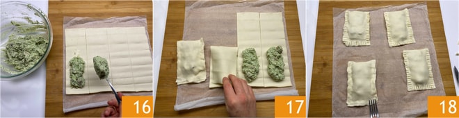 Remplissez-les à moitié, en disposant la garniture au centre et en laissant 1 cm des bords 16 puis refermez la pâte feuilletée, de façon à couvrir la garniture 17. Pincez d'abord avec les doigts puis avec une fourchette, afin de bien sceller les bords 18.