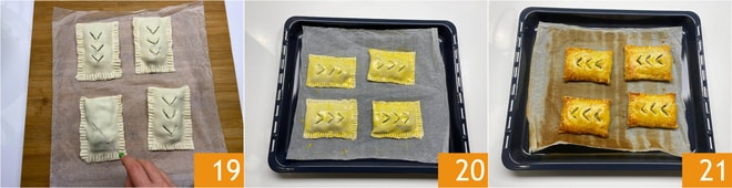 Incisez la surface en créant 3 petites entailles en forme de V 19 et transférez sur une plaque avec du papier sulfurisé. Badigeonnez la surface avec le jaune d'œuf 20 et faites cuire dans un four statique, préchauffé à 200°, pendant environ 20/25 minutes. Sortez du four et servez vos feuilletés encore chauds 21 !