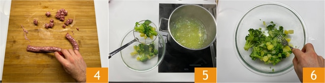 En attendant, prenez la saucisse, retirez le boyau et coupez-la en morceaux 4. Lorsque les brocolis et pommes de terre sont tendres, égouttez-les bien dans un bol 5 et écrasez-les avec une fourchette 6.