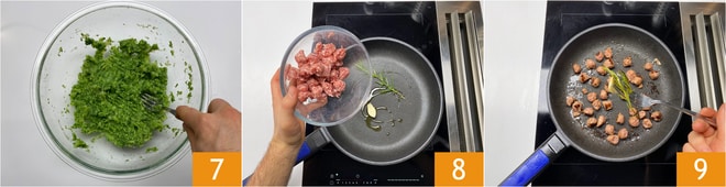 Vous devez obtenir une purée homogène 7. À ce stade, versez dans une poêle un filet d'huile, une branche de romarin et une gousse d'ail 8. Ajoutez la saucisse 8 et laissez-la dorer jusqu'à ce qu'elle soit bien dorée. Retirez ensuite les arômes 9.