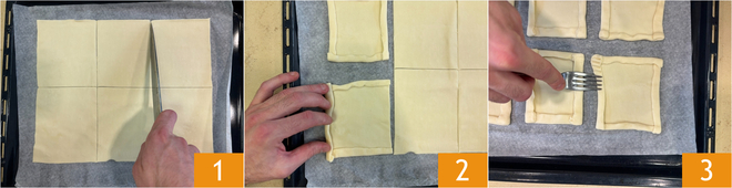 Pour préparer les feuilletés aux fraises, commencez par la base: déroulez la pâte feuilletée directement sur une plaque de cuisson et découpez-la en 6 rectangles 1. Repliez les bords vers l'intérieur 2 et appuyez avec les dents de la fourchette pour créer un motif décoratif 3.