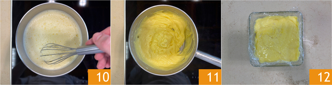 Cuisez à basse température pendant environ 10 minutes en mélangeant avec le fouet 10 jusqu'à ce que la crème pâtissière commence à épaissir 11. Retirez la crème du feu, transférez-la dans un plat, laissez-la tiédir, puis couvrez avec un film plastique au contact et laissez bien refroidir au réfrigérateur.