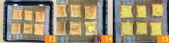 Entre-temps, les feuilletés seront cuits, alors sortez-les du four et laissez-les refroidir 13. Vous êtes prêt à assembler les douceurs: garnissez les bases avec la crème pâtissière 14 15.