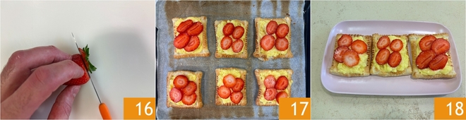 Lavez les fraises, retirez le pédoncule 16 et coupez-les en rondelles. Répartissez les tranches de fraises sur la crème 17 et servez immédiatement vos feuilletés aux fraises 18!