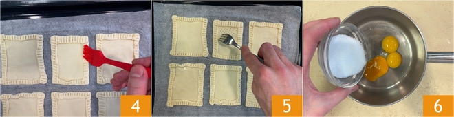 Badigeonnez tous les bords avec le blanc d'œuf 4 et percez la base avec la fourchette 5. Faites cuire les feuilletés dans un four préchauffé ventilé à 200° pendant environ 8 minutes. En attendant, préparez la crème pâtissière: mettez les jaunes d'œufs et le sucre dans une petite casserole 6.
