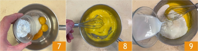 Ajoutez la fécule de maïs tamisée 7 et mélangez avec un fouet à main pour amalgamer les ingrédients 8. Versez le lait en filet tout en mélangeant avec le fouet 9.