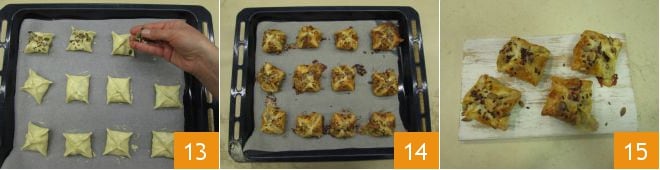Formez les feuilletés en ramenant vers le centre d'abord les deux extrémités, puis les deux autres côtés 10 ; faites correspondre les pointes et pincez la pâte pour les fermer 11. Transférez le tout sur une plaque recouverte de papier sulfurisé et badigeonnez avec du jaune d'œuf et de la crème battus 12.