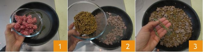 Pour préparer les feuilletés aux lentilles, saucisse et fromage, commencez par la cuisson de la saucisse. Après l'avoir épluchée et coupée en morceaux, mettez-la dans une poêle avec un filet d'huile 1. Faites-la revenir quelques minutes à feu vif jusqu'à ce qu'elle soit dorée, en la défaisant avec une cuillère en bois. Dès que la viande change de couleur et de consistance, ajoutez les lentilles précuites 2. Assaisonnez avec quelques brins de thym effeuillé, une pincée de poivre et, éventuellement, rectifiez le sel 3.
