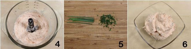 Vous devez obtenir une consistance crémeuse 4. Hachez finement la ciboulette 5 et incorporez-la à la mousse 6, puis mettez le mélange dans une poche à douille avec une douille étoilée.