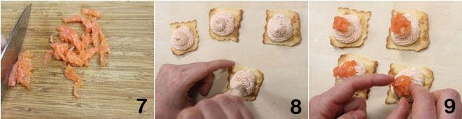 À ce stade, coupez le reste du saumon en julienne 7 et commencez à composer les amuse-bouches : pressez une petite touffe de crème de saumon sur chaque cracker 8 et disposez de petits morceaux de saumon fumé 9.