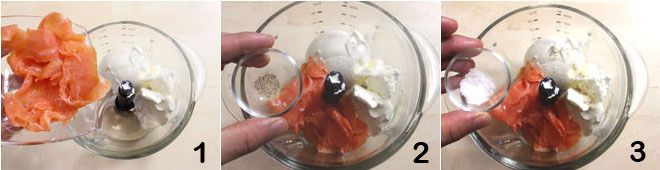 Pour préparer les feuilletés classiques au quark et saumon fumé, commencez par préparer la mousse de saumon. Dans un mixeur, mixez le fromage quark avec 80 g de saumon 1, une pincée de poivre blanc 2 et une pincée de sel 3, juste assez pour assaisonner.