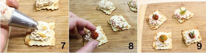 À ce stade, transférez le mélange dans une poche à douille avec embout étoilé et commencez à composer les feuilletés en pressant une touffe de crème de ricotta et poivrons grillés sur chaque feuilleté 7, puis placez au centre une lanière de poivron enroulée 8 et enfin quelques feuilles de sarriette sur chaque poivron 9.
