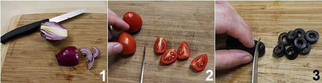 Pour préparer les feuilletés aux olives avec tomates et miettes de feta, commencez par éplucher l'oignon rouge, divisez-le en deux et coupez-le en fines tranches 1. Lavez et séchez les tomates cerises et coupez-les en quartiers 2. Égouttez les olives et coupez-les en rondelles 3.