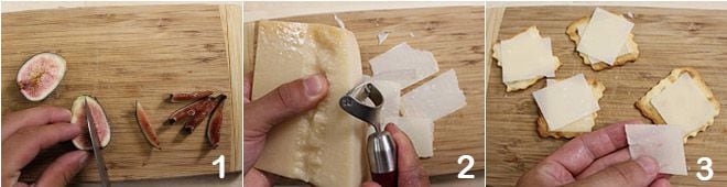 Pour préparer les feuilletés classiques avec figues, parmesan et miel, commencez par bien laver les figues et les couper en quartiers assez fins 1. À l'aide d'un éplucheur, découpez des copeaux de fromage parmesan 2 et disposez-en quelques-uns sur chaque feuilleté 3.