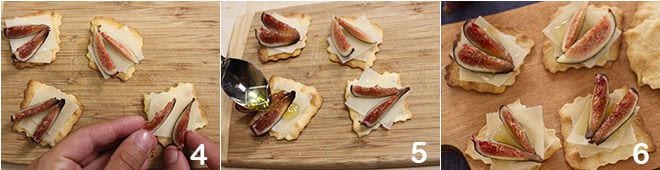 Puis, posez deux quartiers de figue sur chaque feuilleté 4 et garnissez d'une cuillère à café de miel toutes fleurs 5. Les feuilletés classiques avec figues, parmesan et miel sont prêts 6 : servez-les et dégustez-les rapidement pour ne pas en perdre la fraîcheur !