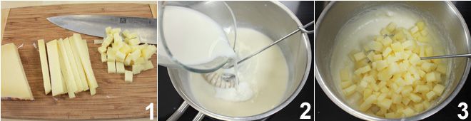 Commencez par préparer la crème de Montasio : retirez la croûte du fromage et coupez-le en petits cubes 1. Faites fondre le beurre dans une casserole à fond épais, ajoutez la farine et mélangez bien avec un fouet, puis incorporez le lait 2, en continuant à mélanger pour obtenir une béchamel très fluide. À ce stade, incorporez le fromage Montasio 3.